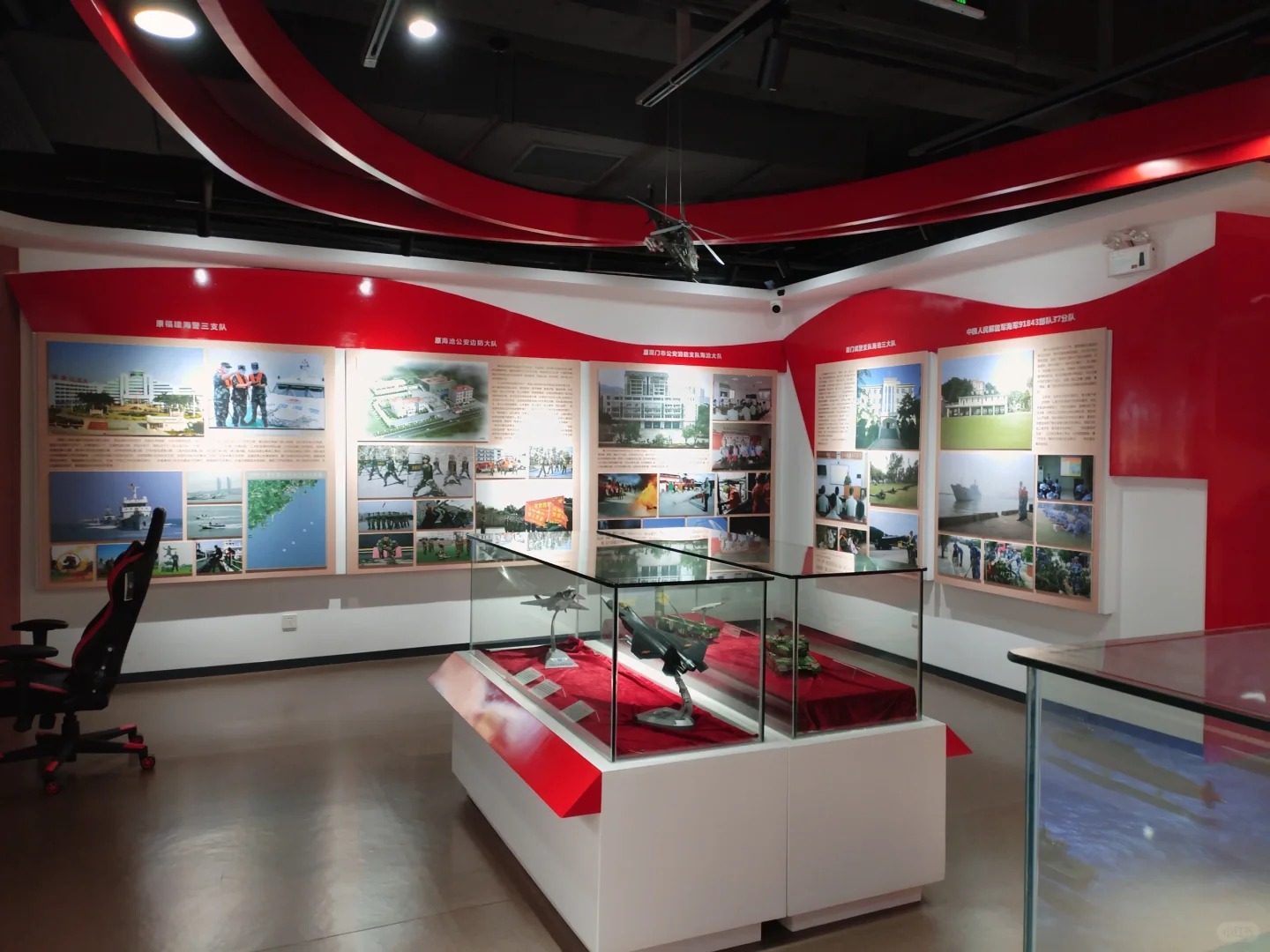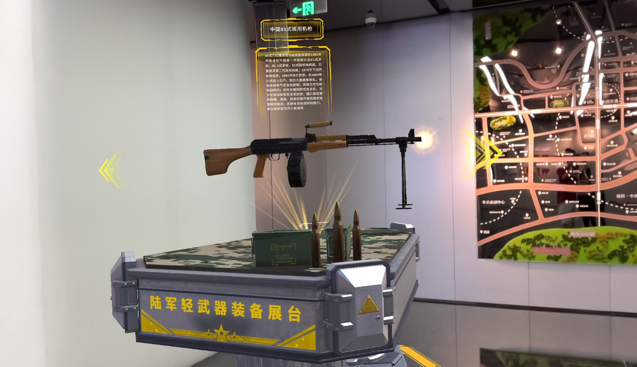 通过AR时光长廊形式,参观者扫描墙面图文,即可触发相应历史阶段的党建大事与国防建设成就的虚拟扩展内容,形成时空对话。