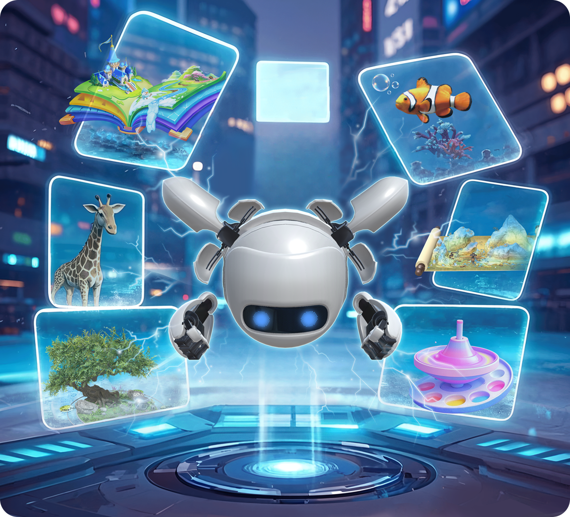 工具集群:AI萌库、AI绘梦、AI绘本、AI时空相遇、AI+XR空间共生编辑器,覆盖从感知到创作的全过程